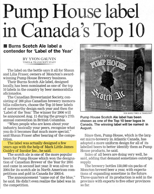 | Pump House label in Canada's Top 10 Burns Scotch Ale label a contender for 'Label of the Year' By Yvon Gauvin Their Burns Scotch Ale label, designed locally, has been nominated as one of the top 10 labels in the country by beer memorabilia aficionados. The Canadian Brewerianist Society, consisting of 200 plus Canadian brewery memorabilia collectors, choose the Top 10 beer labels of noteworthy design each year and then the 'Label of the Year.' The winner for 2006 will be announced Aug. 11 during the group's 27th annual convention in British Columbia. "When people who are keen about your industry, basically your peers, recognize what you do it becomes that much more special," said Shaun Fraser after hearing of the competition. The label was actually designed a few years ago with the help of Mark Little James Guidry of Incolor Inc., he said. The scotch ale is one of the more popular beers for Pump House which won the designation of Canadian Brewer of the Year for 2005 and came in second last year. It won silver in 2004 for its scotch ale in North American competitions and gold in Canada for 2005-6. The announcement "came out of the blue," he said. He didn't even realize the label was in the competition. Since then, Pump House, which is the largest micro-brewery in Atlantic Canada, has adopted a more uniform design for all of its labelled beers to better identify them as Pump House products, he said. Sales of all beers are doing very well, he said, adding that demand sometimes outstrips supply. The brewery bottles 150,000 six-packs of Moncton-brewed beer a year, with expectations of expanding sometime in the future. Three-quarters of its production is sold in the province with exports to five other provinces so far. The company is also looking to tap into the New England market with its popular ales and fruit-based beers. |